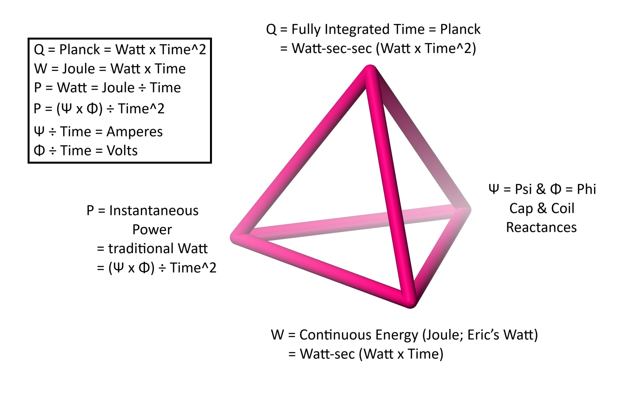 A tetrahedron is a useful metaphor for arranging Eric’s units of electrical measurement in as much as the apex of a tetrahedron represents time in its complete self-integration. For, it is the self-interaction of time with itself, alone, which manifests space and everything else within space, such as: matter and energy, etc. For this complete integration to occur, time must self-interact in four layers, or dimensions, utilizing itself three times which serves as three boundaries layering the separations of the four dimensions of space—time. This triad of self-utilization constitutes the three dimensions of time which makes space and matter and energy possible. Hence, all energy is ultimately described in terms of electrical phenomena. Even the nuclear energy of the atom can be described in these terms.